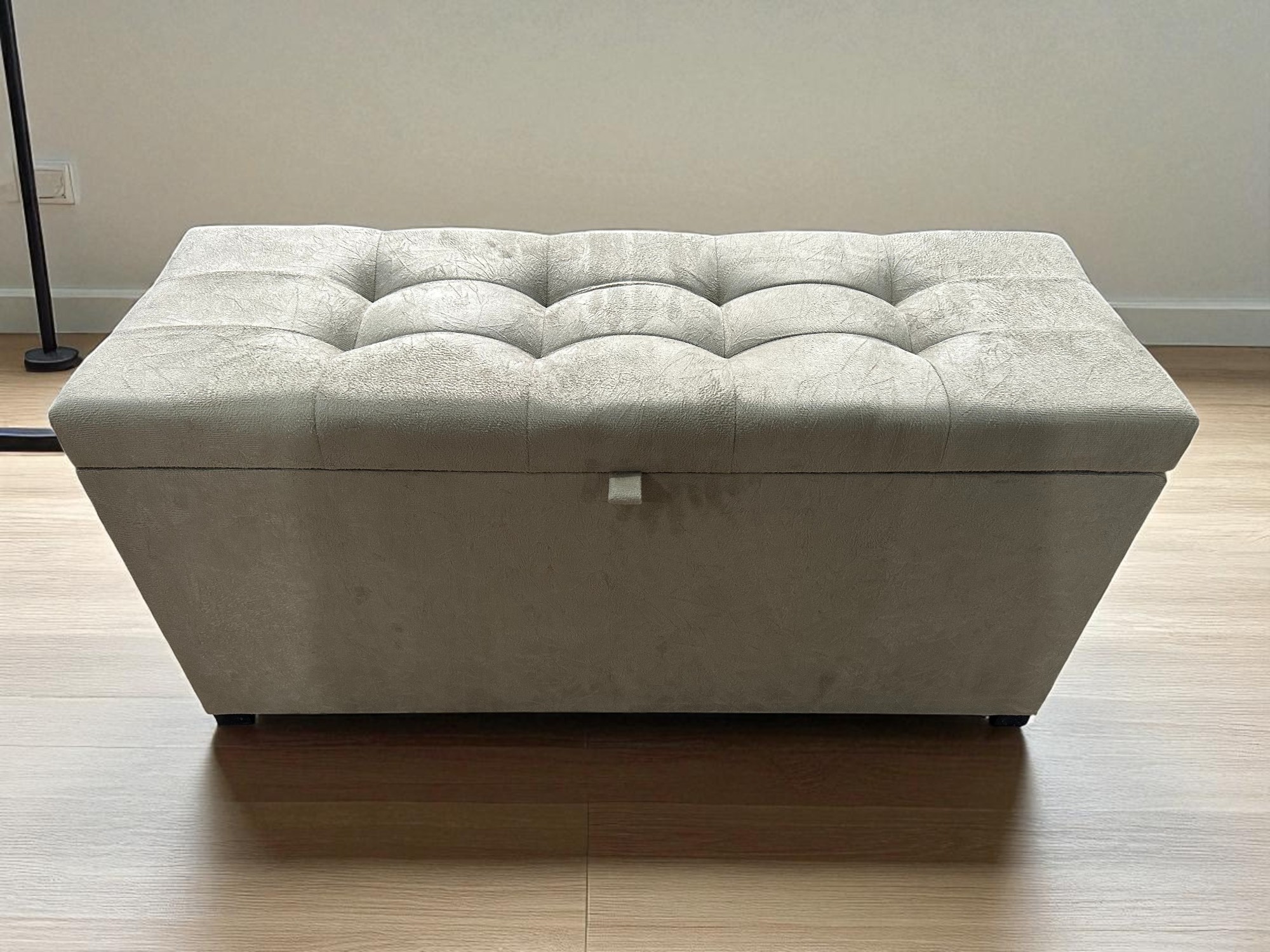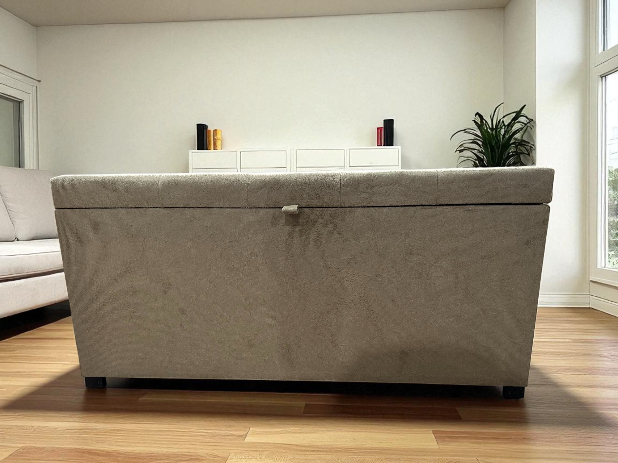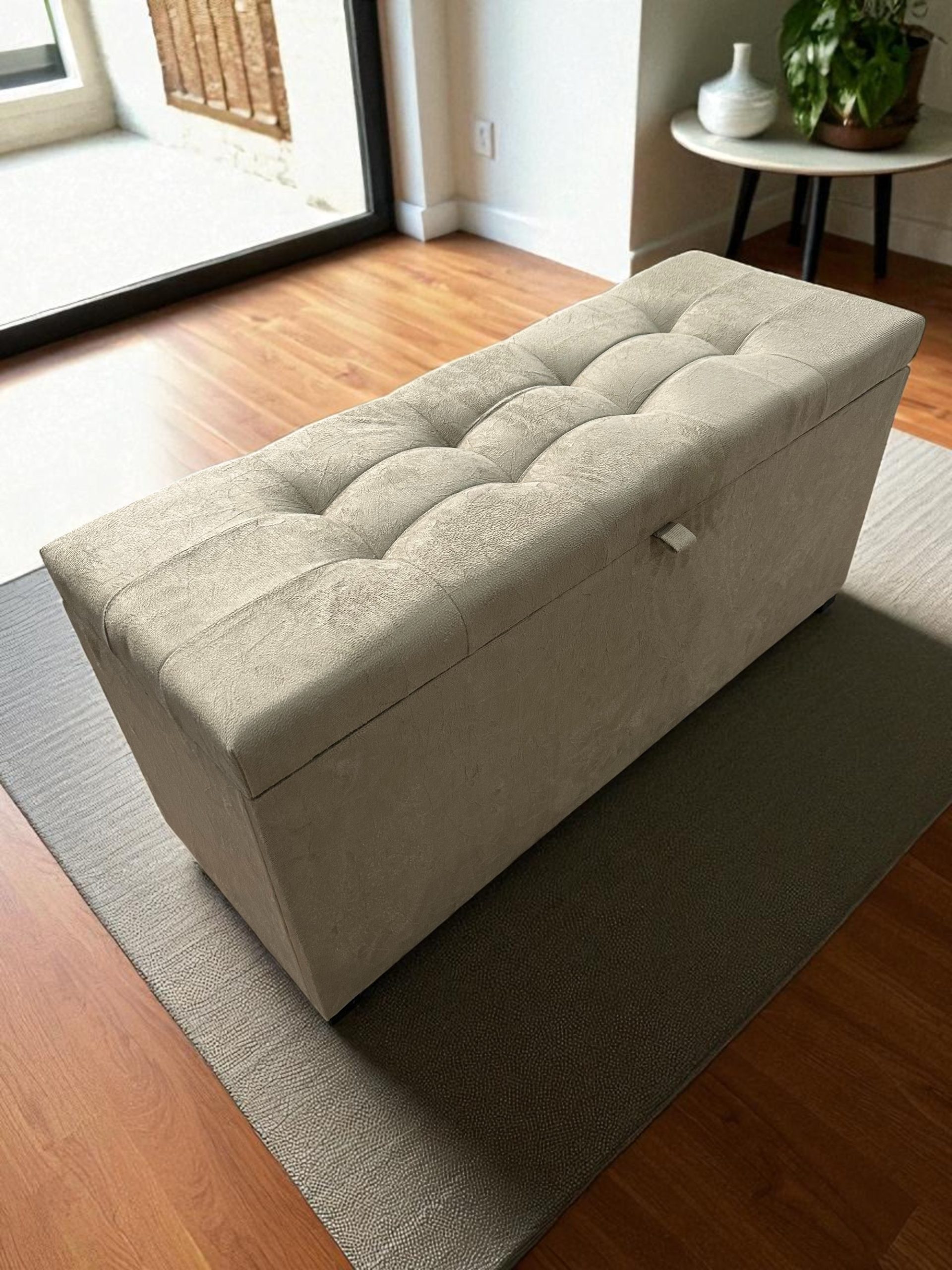 Transforme o ambiente da sua casa com este elegante puff baú, ideal para sala, quarto ou escritório. Produzido com estrutura reforçada em MDF, conta com revestimento em tecido suede macio ao toque e acabamento sofisticado com detalhes na tampa.