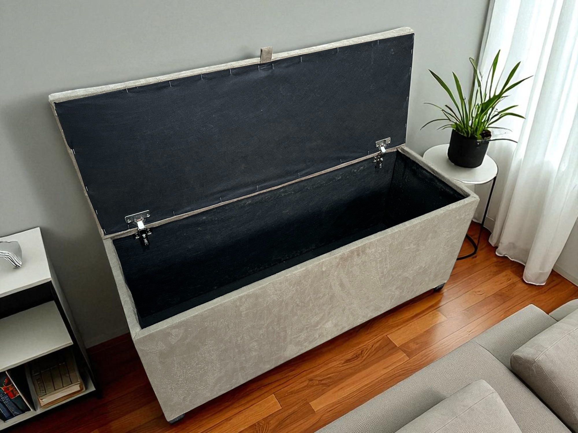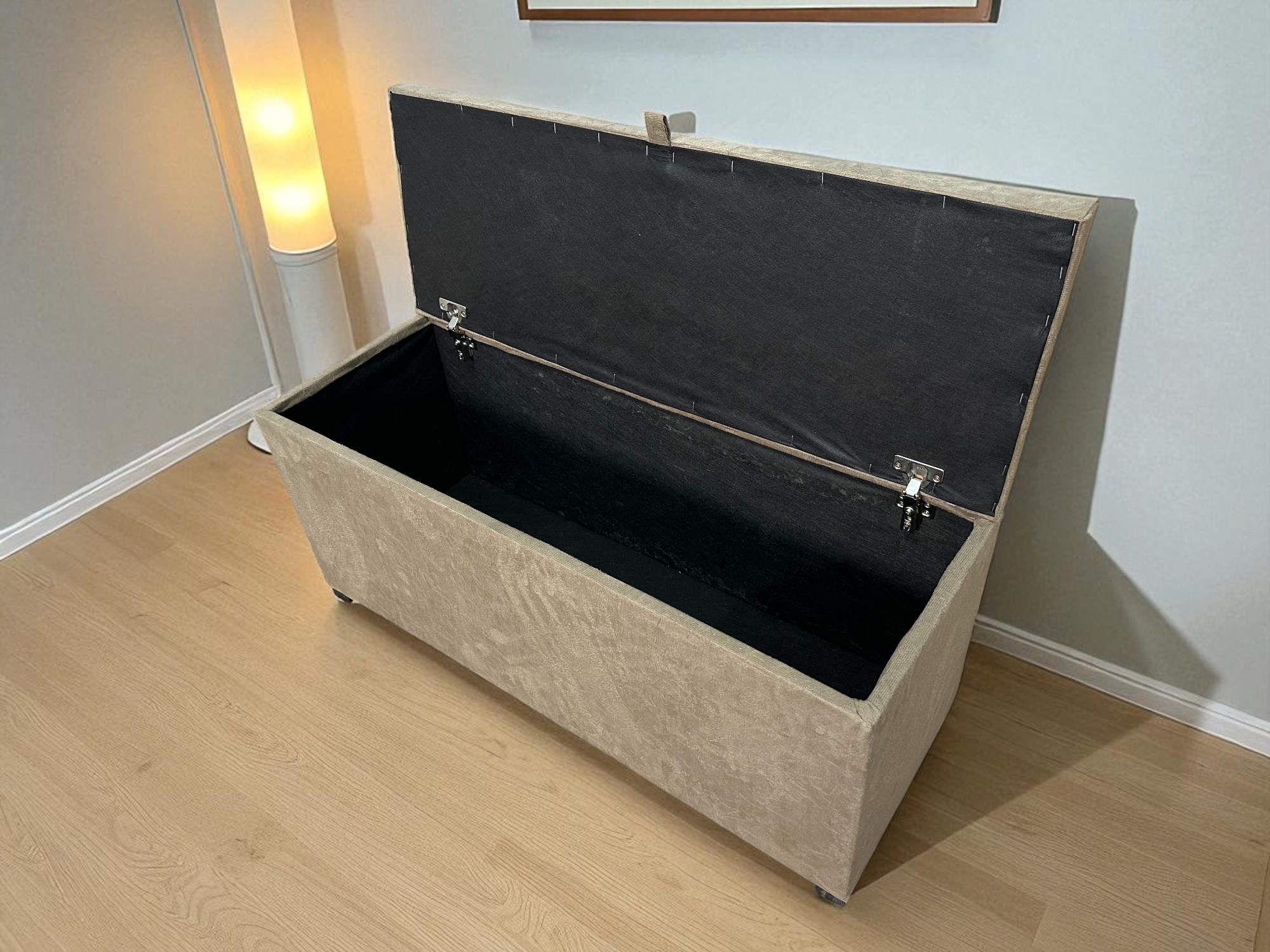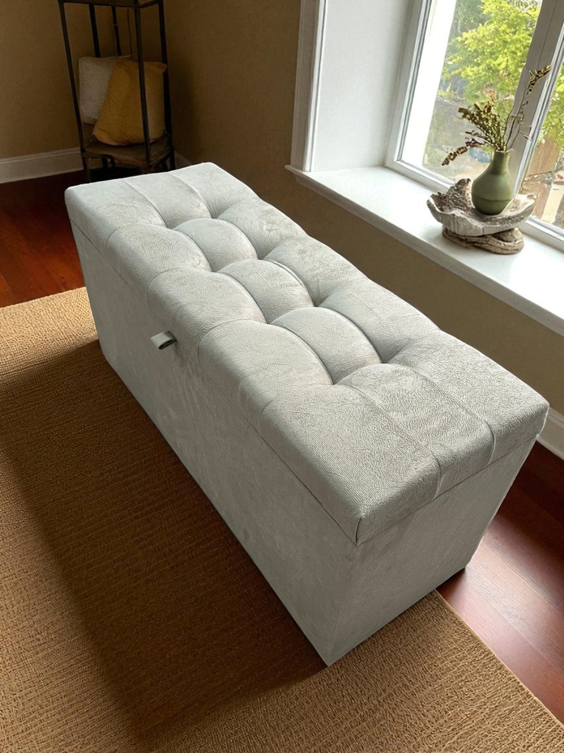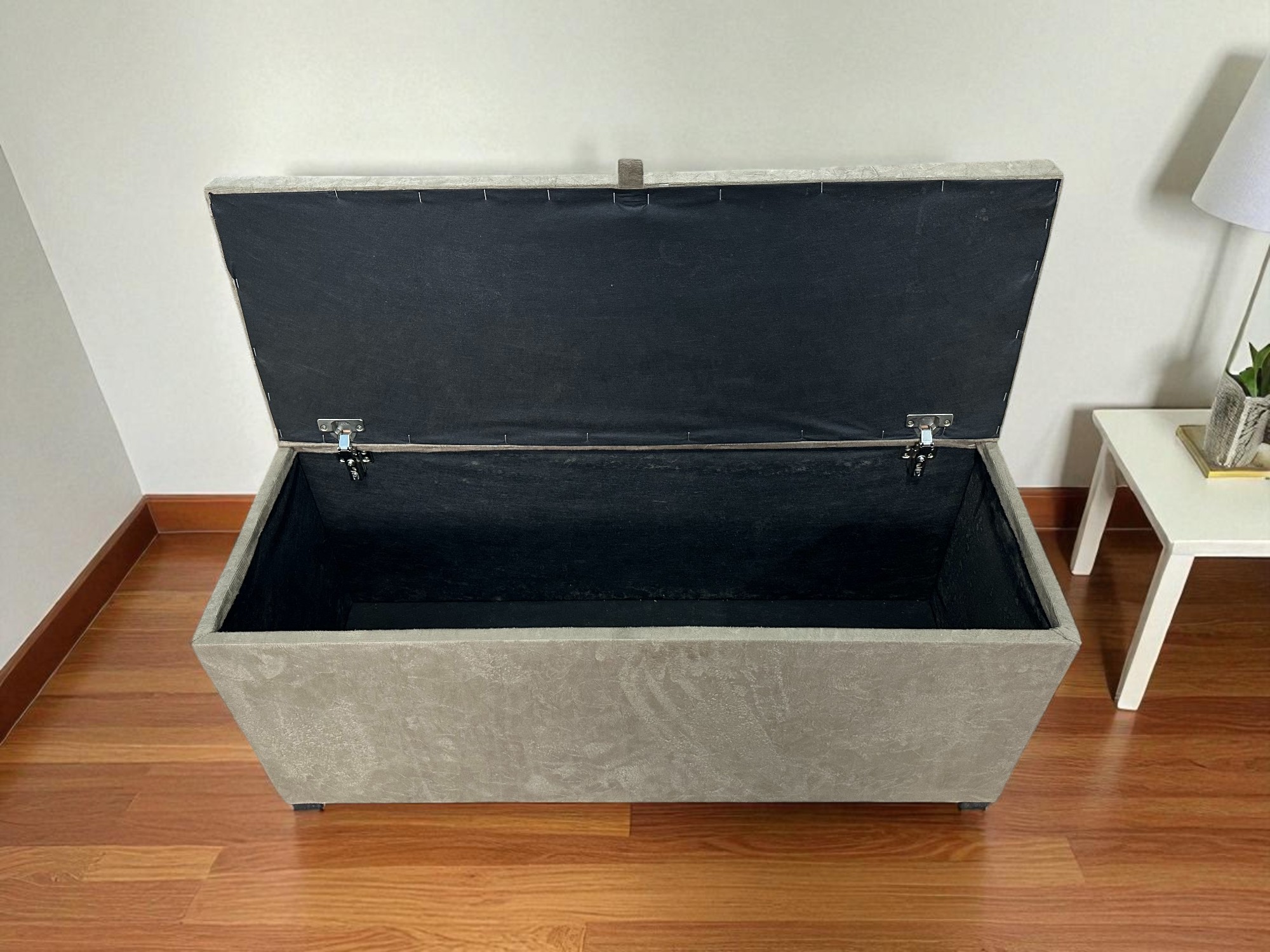 Transforme o ambiente da sua casa com este elegante puff baú, ideal para sala, quarto ou escritório. Produzido com estrutura reforçada em MDF, conta com revestimento em tecido suede macio ao toque e acabamento sofisticado com detalhes na tampa.